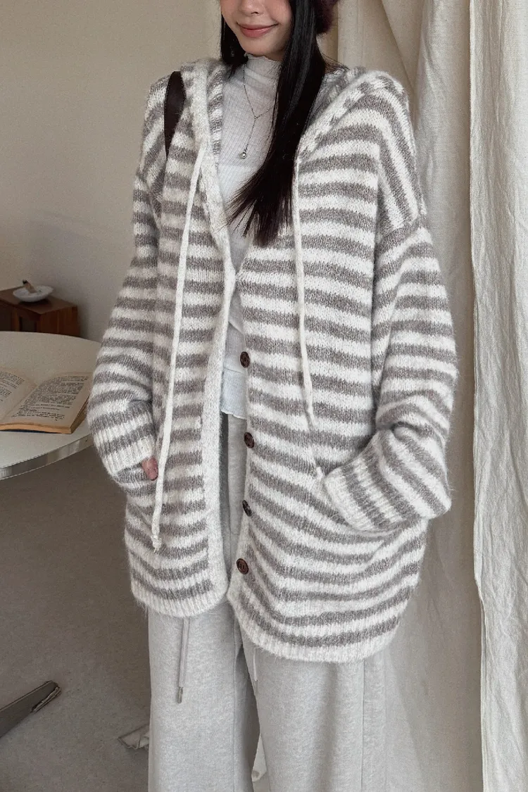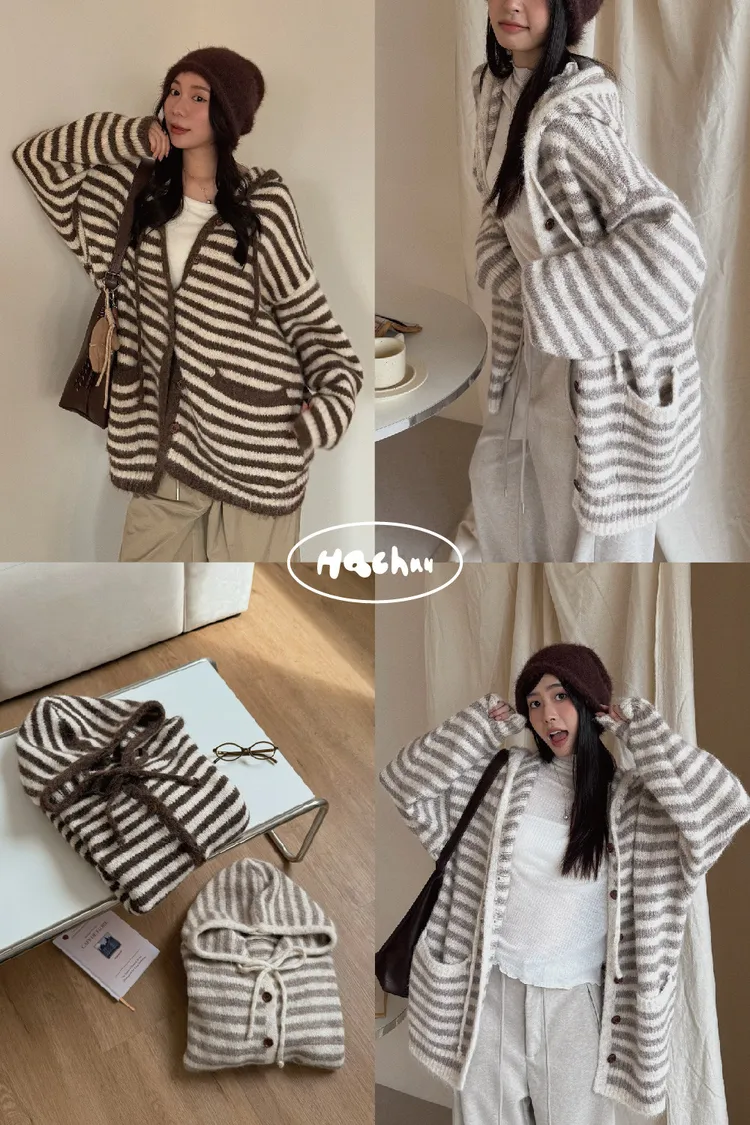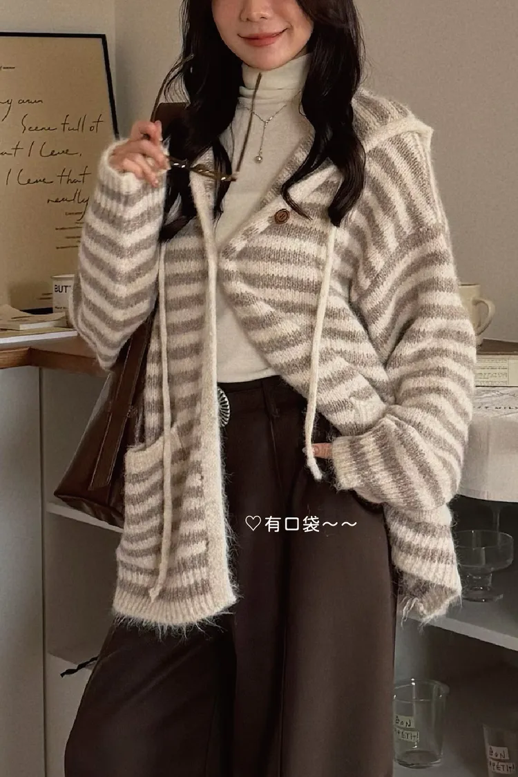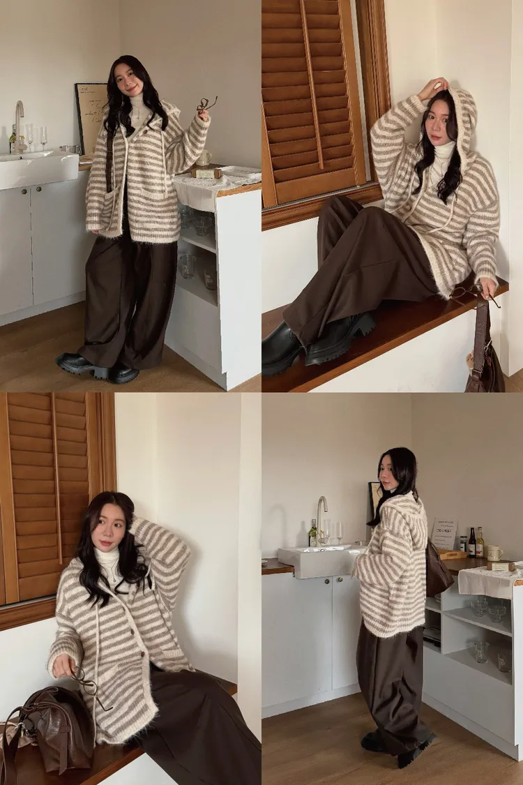 條紋控集合✋🏻✋🏻✋🏻這件咖/米條紋太可愛☕️柔柔軟軟的整件超溫暖~摸起來很舒服~~~這件的橫條紋不會顯胖反而很瘦!寬鬆版型還能遮手臂遮肉肉😚🫶🏻帽子戴起來可愛可愛滴♥♥♥還有一點慵懶的港覺🐻🤎尺寸指南♡里長娘:162/51涵:157/43綵晨:164/43子瑄:163/65李妮:160/43